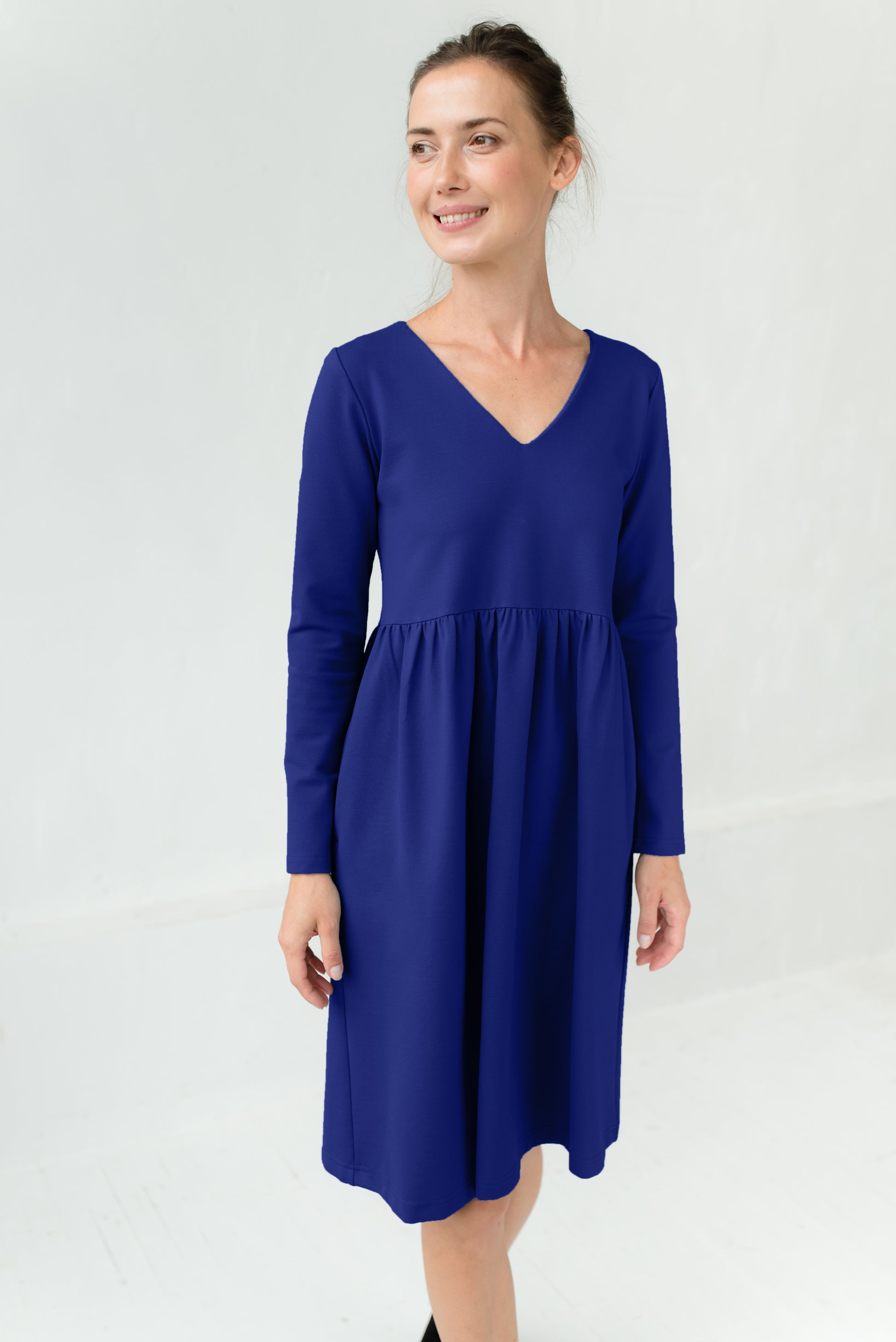 SUNSHINE dunkelblaues Freizeitkleid. Die Farbe des Kleides ist bereits ein Klassiker, daher ist es einfach, mit diesem Kleid einen eleganten Look zu kreieren. Der V-Ausschnitt stellt das Gesicht schön dar und betont es. Raffungen an der Taille verleihen diesem minimalistischen Design mehr Lebendigkeit und bringen Ihre Taille auf subtile Weise zur Geltung. Das Kleid endet knapp über den Knien und hat Taschen.
