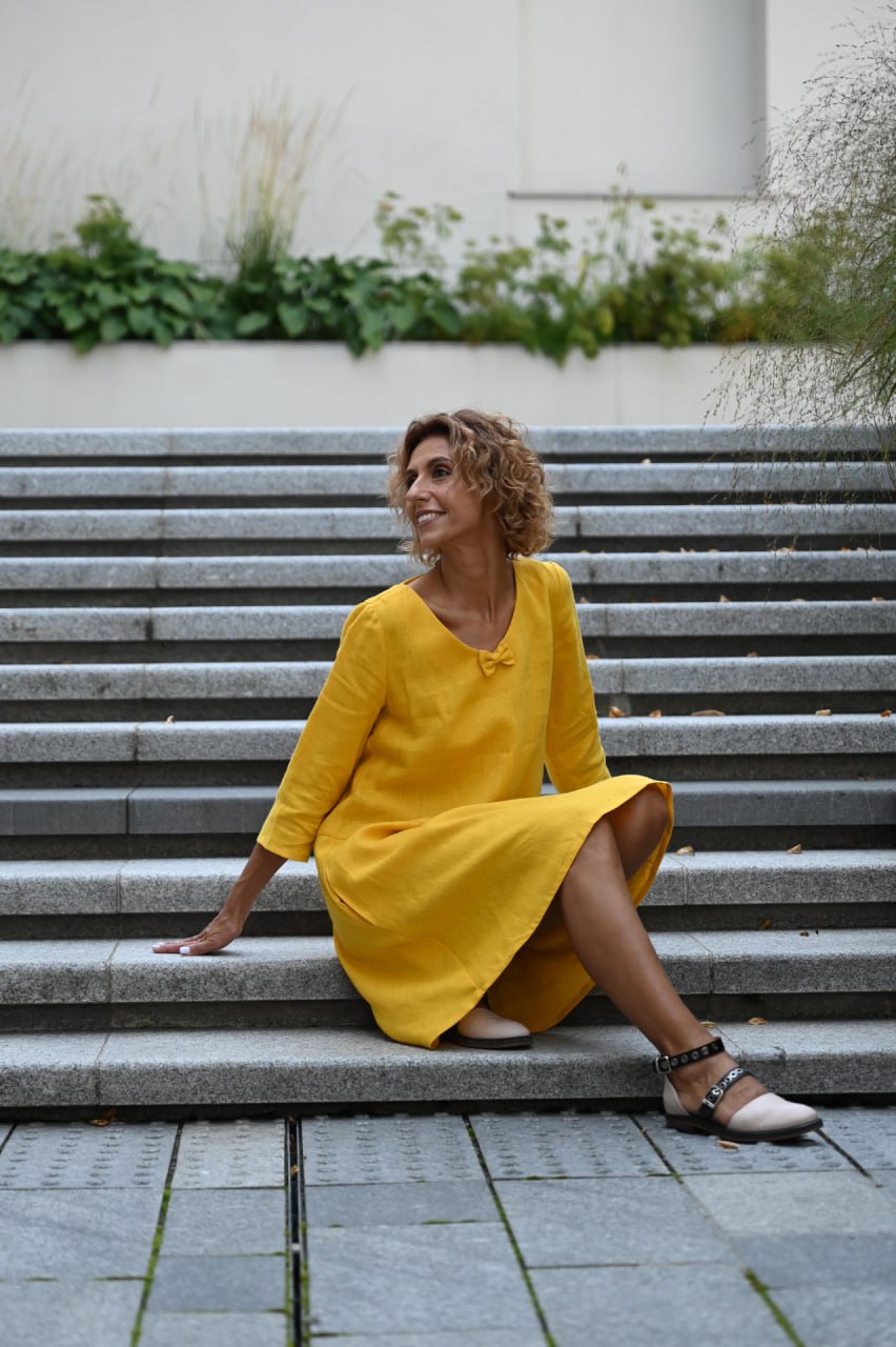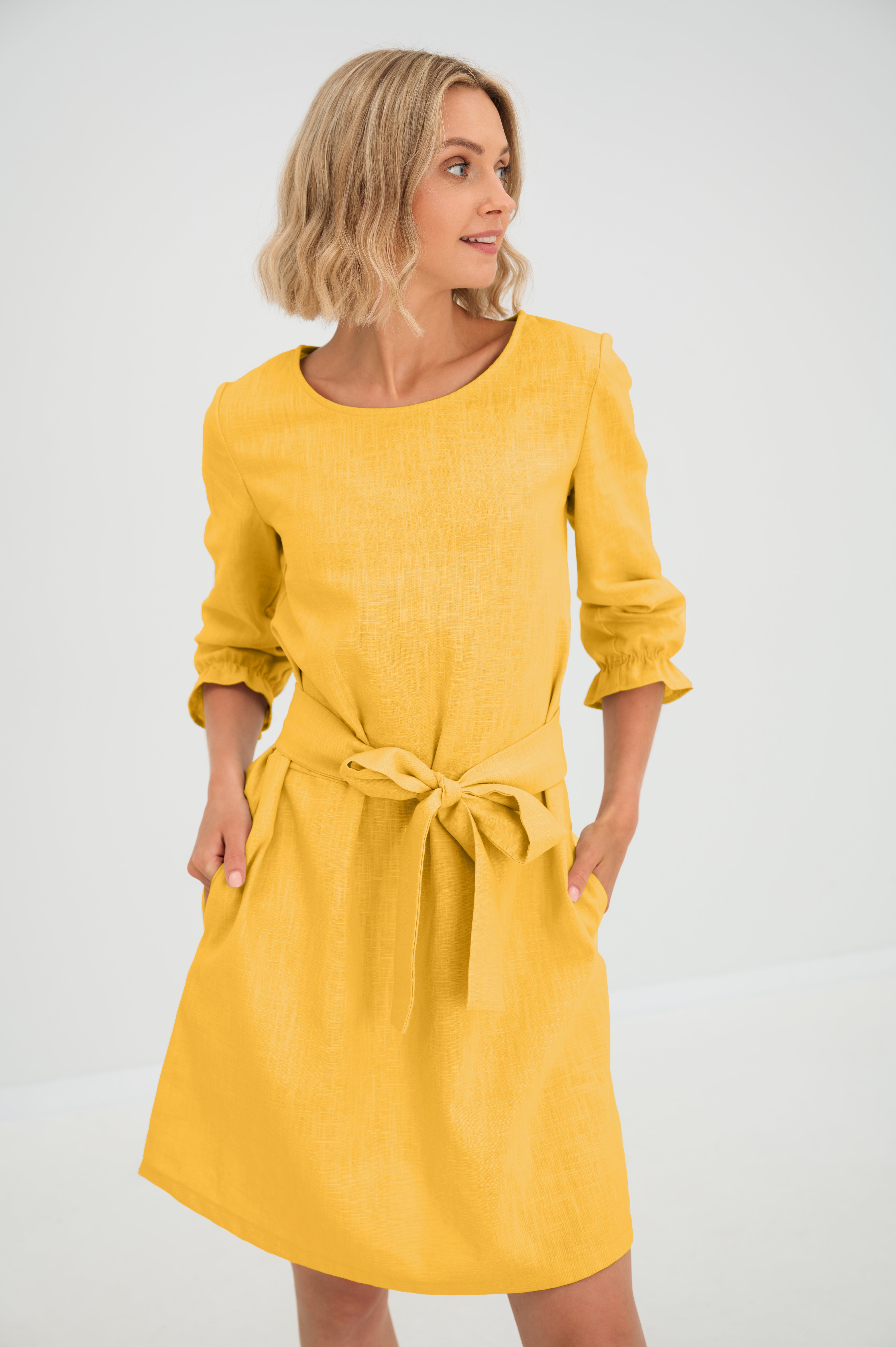 Ši suknelė skirta pagerinti jūsų dienas. Jis pagamintas iš lino, o tai reiškia, kad saulėkaitoje jums nebus per karšta. Tai puikiai tinka įvairiems kasdieniams dalykams – darbui, kavai su draugais ar tiesiog buvimui lauke. Geltona spalva yra tarsi šiek tiek saulės, todėl ją lengva plauti ir vėl dėvėti. Su šia suknele atrodysite gerai be jokių rūpesčių.